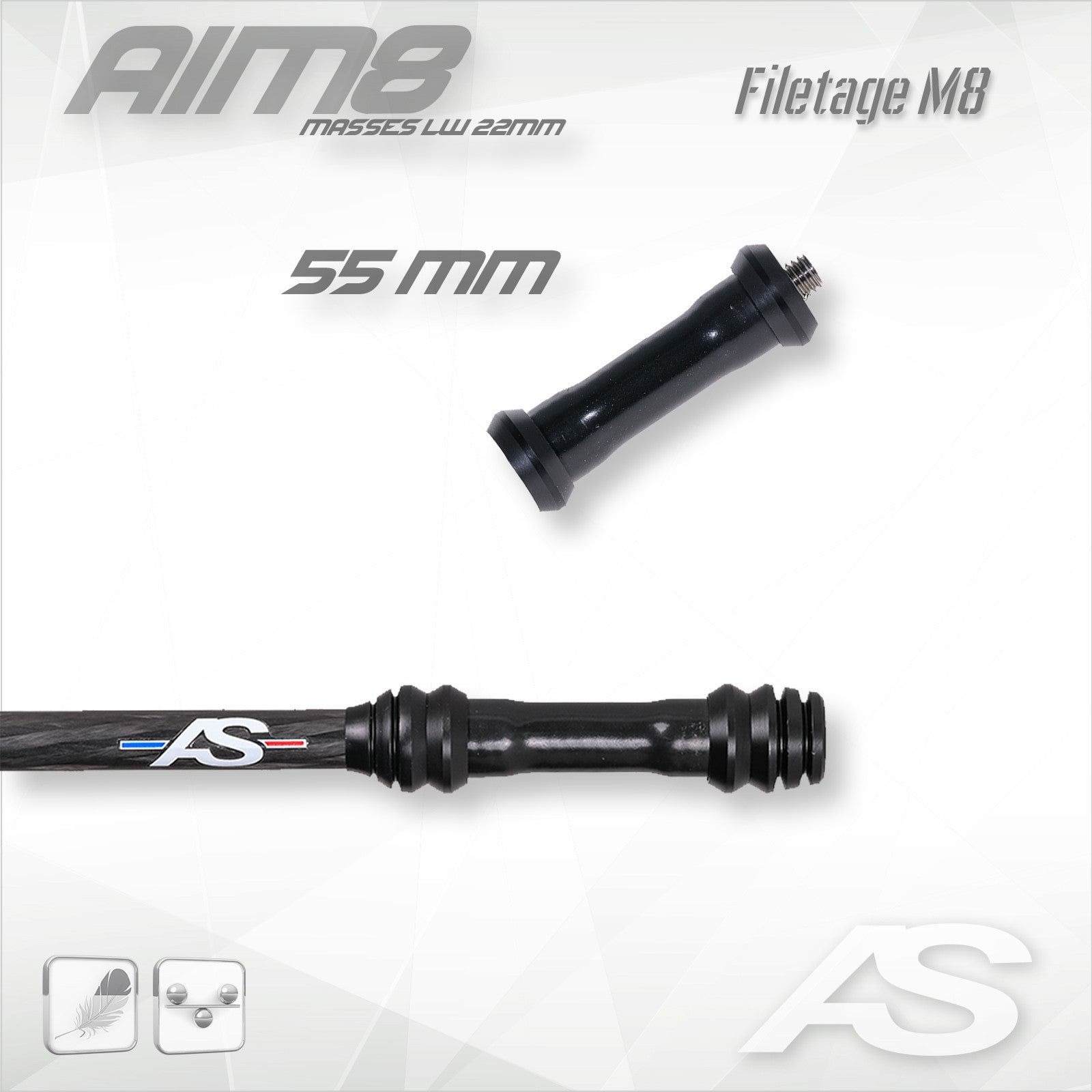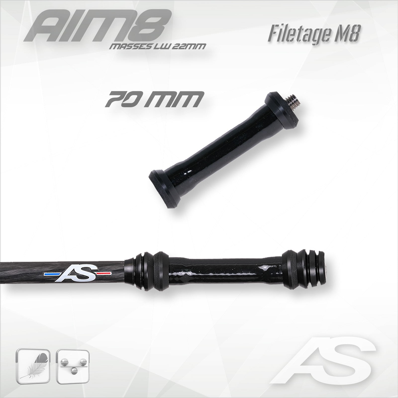 Not compatible with ARC SYSTEME stabilizers and weights (M8 thread).