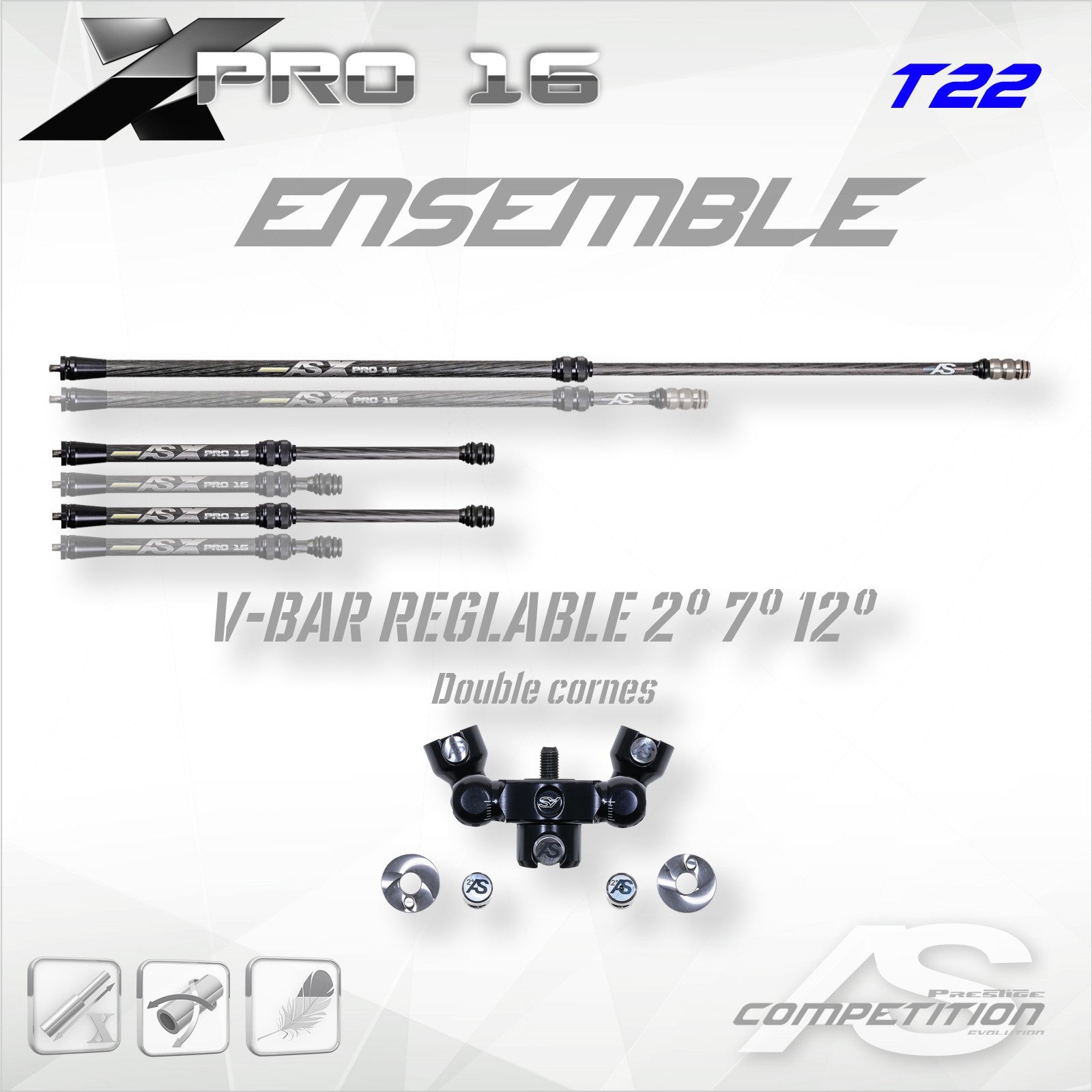 Telescopic kit 16mm with VBAR TRIO (do not mount on carbon directly). Weights fixing tulip included (T12/22 or T12/35). T22 comes with 2 intermediate weights and 1 finishing weight (22mm and 30g each). T35 tulip alone. Telescopic dimensions from 52.5 to 80cm (21 to 31.5in). Telescopic dimensions from 22.5 to 35cm (9 to 14in). Graduations per inch (25mm). Tightening wrench supplied.