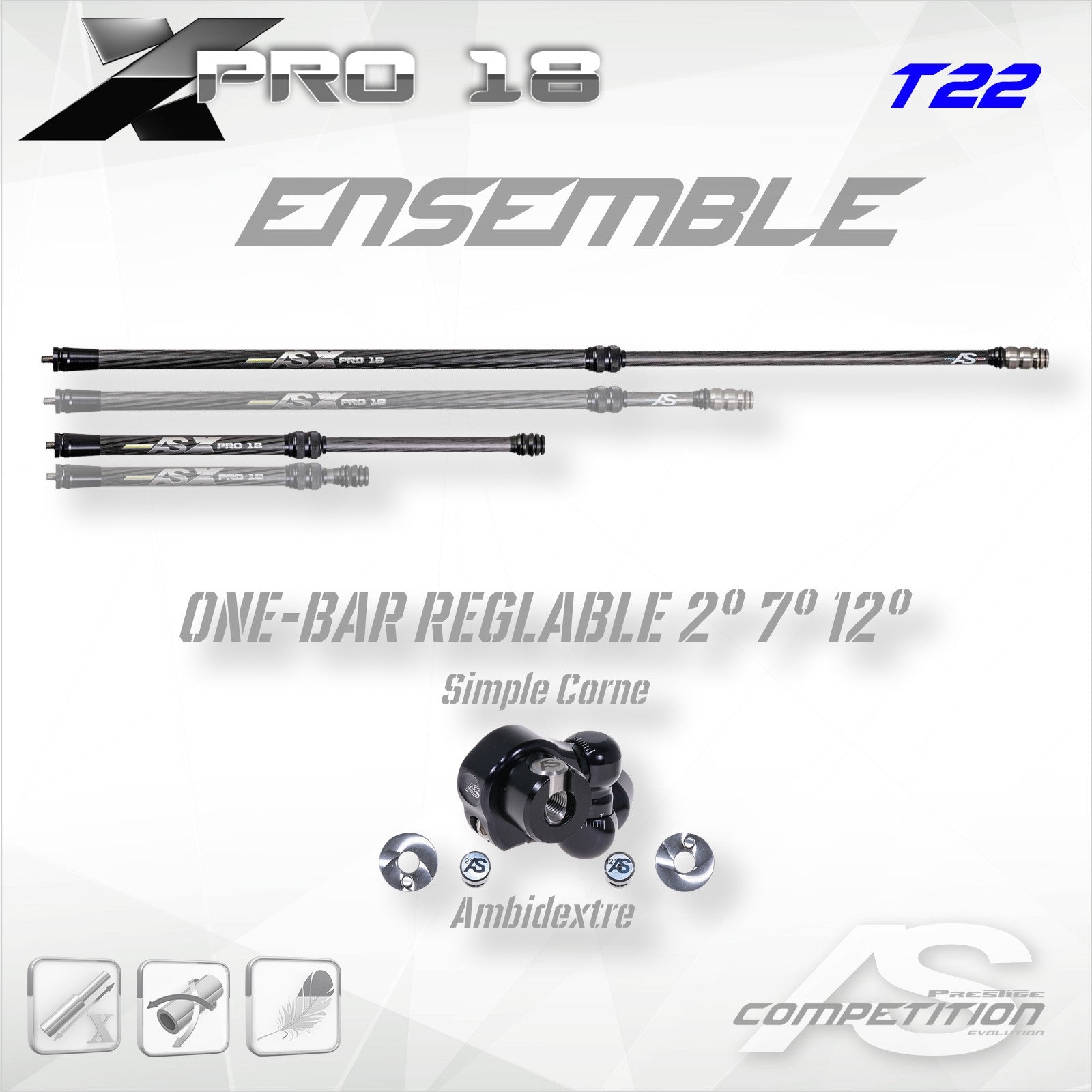 Telescopic kit 18mm with VBAR TRIO (do not mount on carbon directly). Weights fixing tulip included (T14/22 or T14/35). T22 comes with 2 intermediate weights and 1 finishing weight (22mm and 30g each). T35 tulip alone. Telescopic dimensions from 55 to 85cm (22 to 33.5in). Telescopic dimensions from 25 to 40cm (10 to 16in). Graduations per inch (25mm). Tightening wrench supplied.