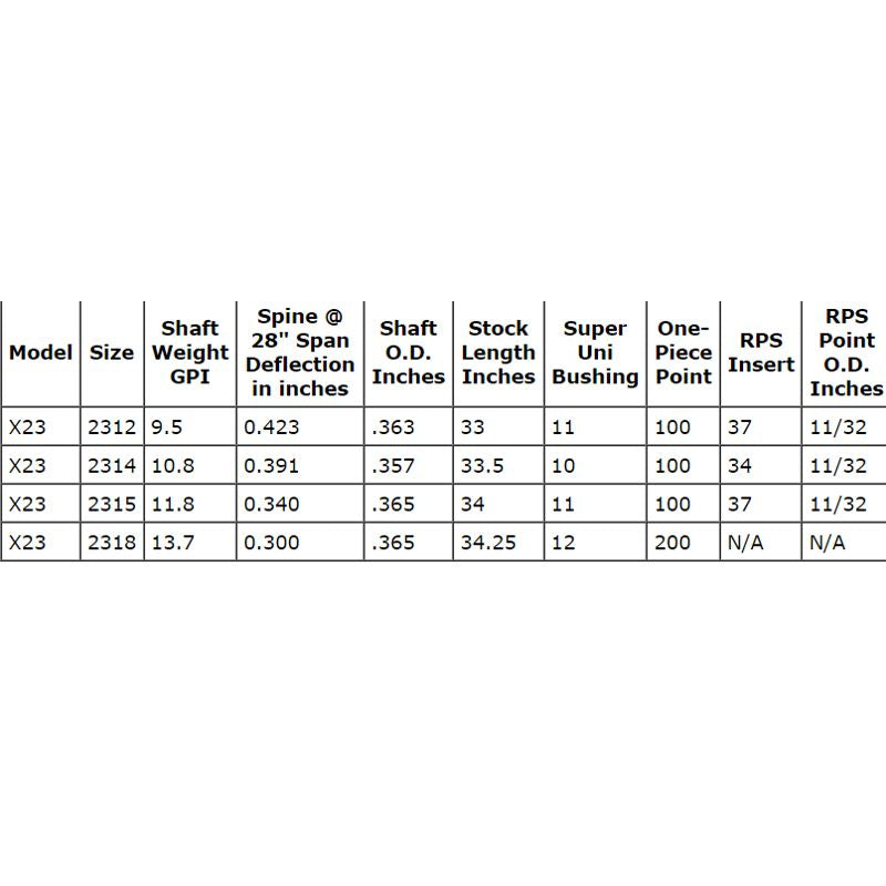 The X23 sizes, including the new 2318, are World Archery compliant where 9.3mm is the maximum allowable shaft diameter. The X-Series is available in four line-grabbing large OD sizes: 2312, 2314, 2315, 2318.