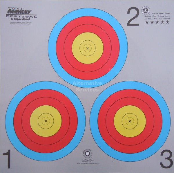 Official NFAA licensed faces. These are the official faces as used at the World Archery Festival - Las Vegas. This 17 inch square (40cm) face features a 3 spot triangular format on a grey background. Produced from 100# tag (card) stock....