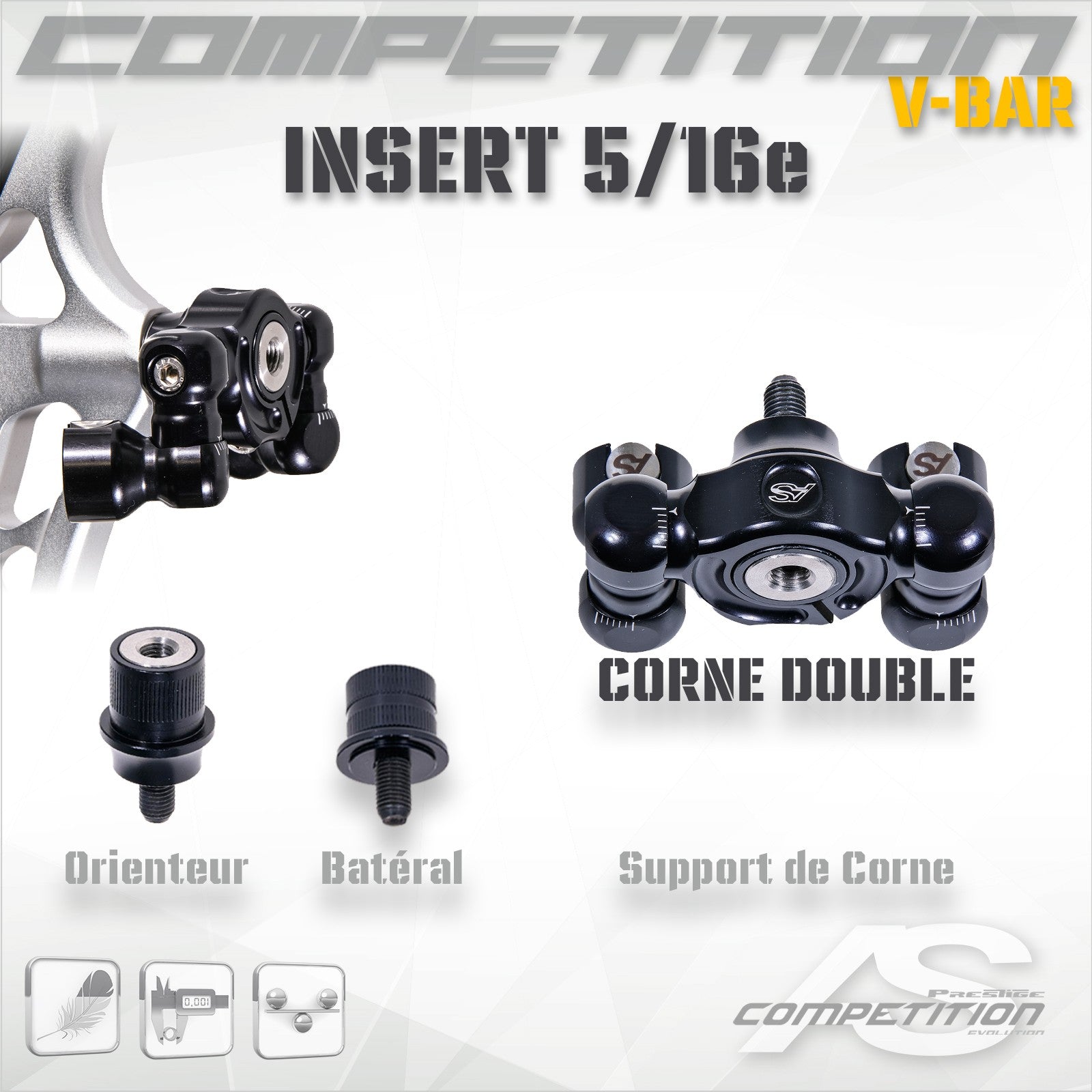 Complete system. Mount assembled in the middle of the bow grip (aesthetic tulip included). Middle and bottom exploded assembly of bow handle (lateral stud included). Laser graduations. Side horns. Mounted on a 360 degree rotatable support. Steel notching every 7.5 degrees, over 360 degrees, in opening and depth. 5/16in insert, threaded, the firmest attachment.